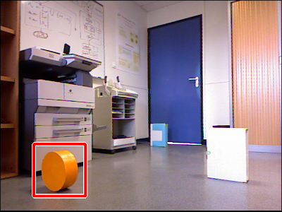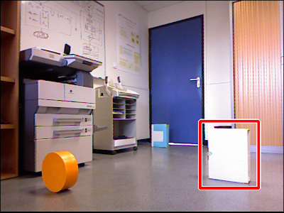The last (but not least!) scientific issue is object recognition: the robots have to locate and identify objects in the environment (fan, bottles, chairs, plants ...). A Microsoft Kinect sensor is mounted on each robot. While navigating and exploring the environment, the robots perfom 3D captures. These captures are analysed to locate objects. The first step of object recognition is based on a region growing on the depth map (from the Kinect). Each candidate is processed and feature parameters are computed. The parameters are compared with a pre-processed objects database and a classifier selects the closest object in the search space. A new classifier, named Class-O-matic, has been proposed; this classifier isolates and keeps only the essential points from training. Some illustrations of the classifier's performance can be seen in the following figures.